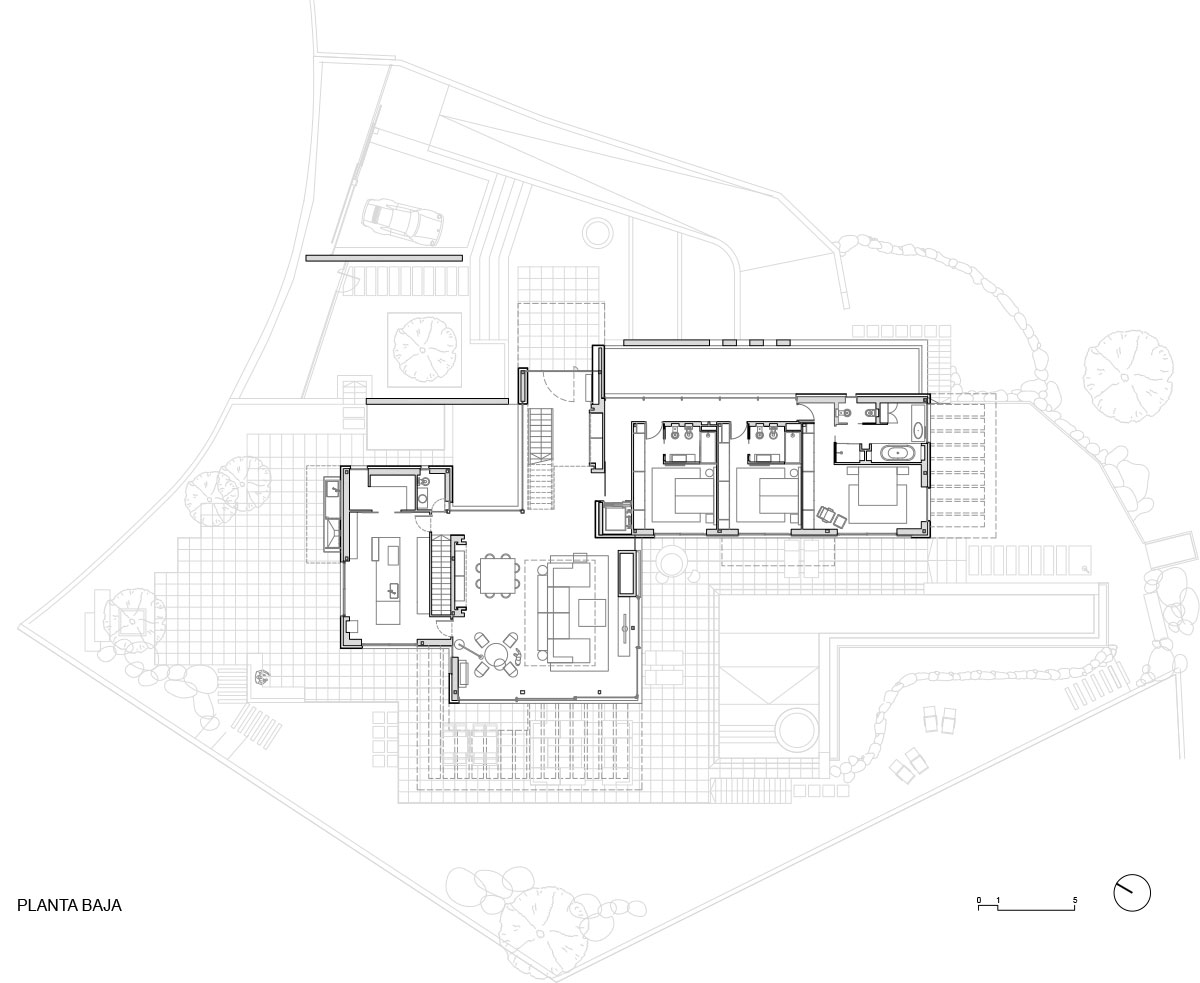 In the night area there are 3 en suite bedrooms on the ground floor and a large bedroom suite on the upper floor. The terrace, which is an extension of the ground floor, generates the feeling of unity between the indoor and outdoor spaces through the large windows that make up the south façade.